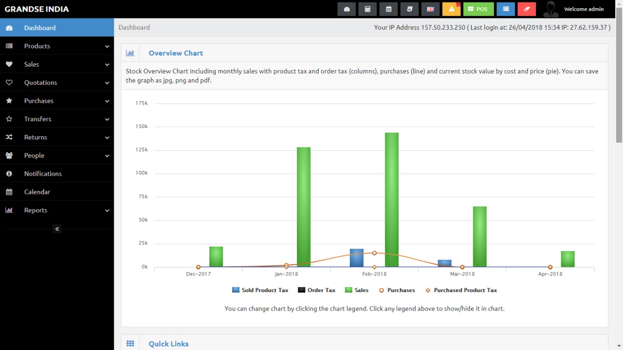 Grandse Billing Software is Web and Desktop application to help you manage your business.Grandse has built-in POS (Point of Sale), Invoice and Inventory System. This Business Solution comes with Products, Purchase, Expenses, Transfers, Sales, Quotations, Gift Cards, Customer, Suppliers, User and Reports modules. You can generate purchase order and/or sales order from quotations. Sales modules have Paypal and Skrill payments with gift cards and deliveries.